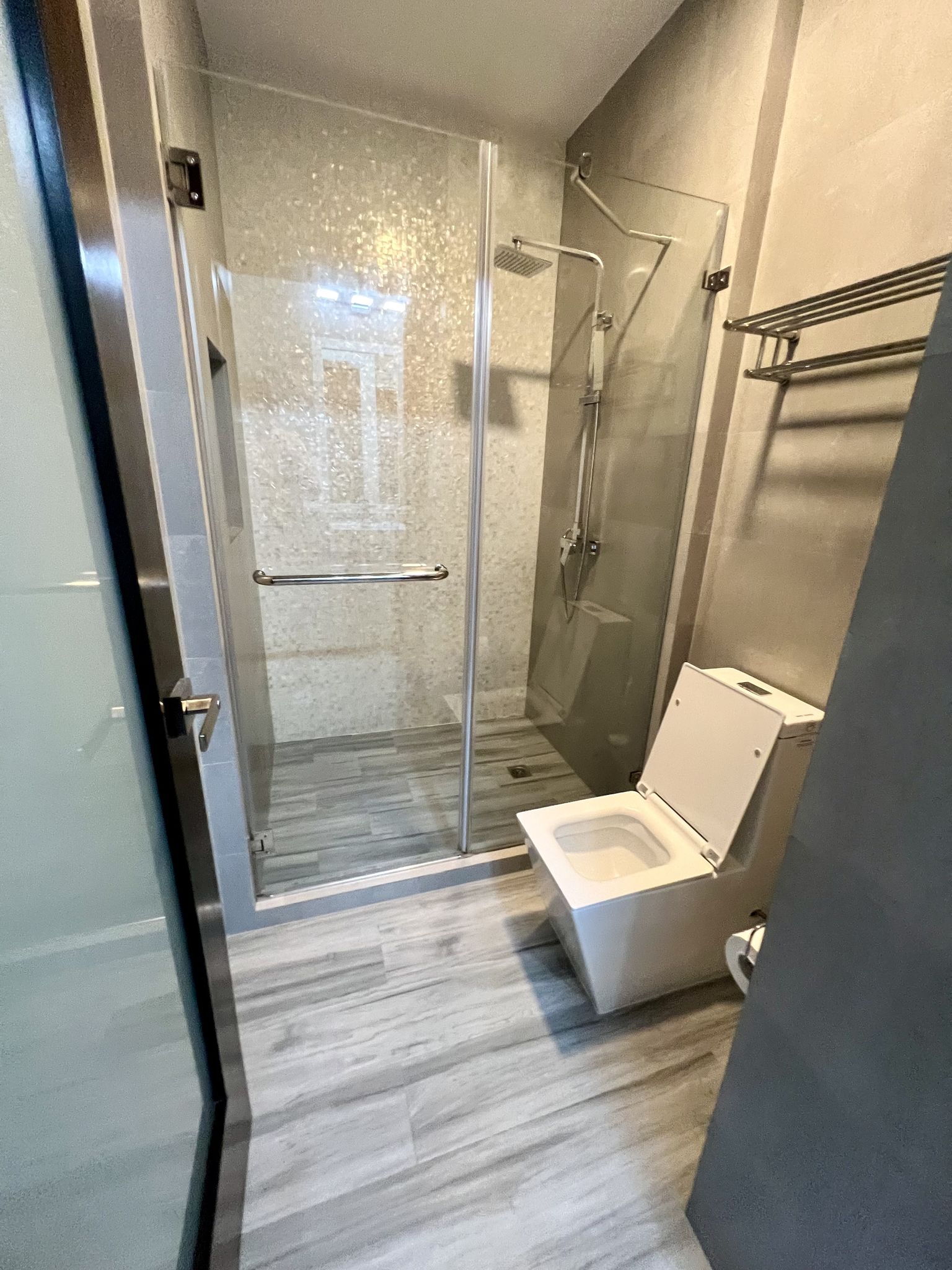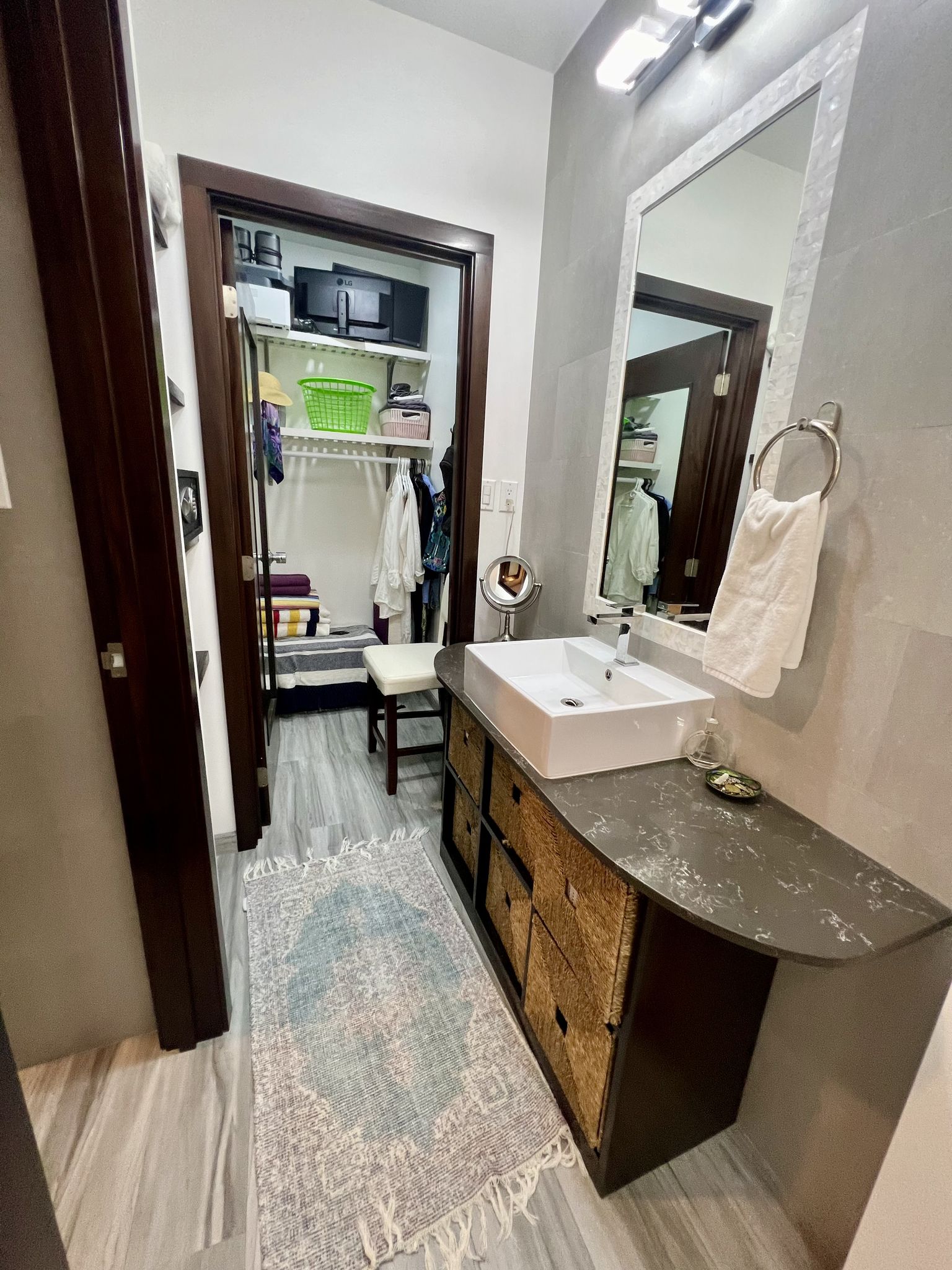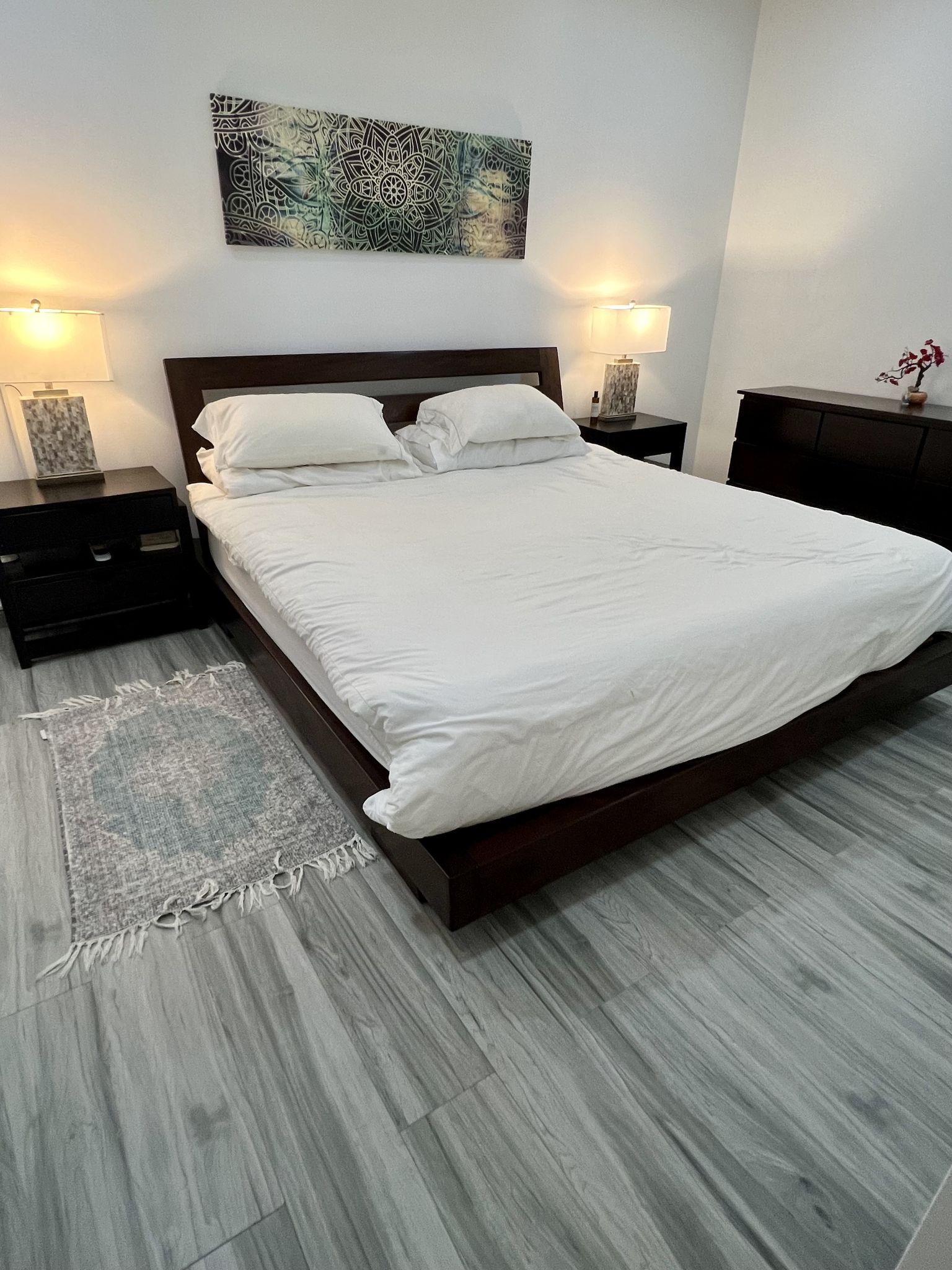 The master bedroom is a sanctuary of peace, featuring a king-sized bed, an ensuite bathroom, and a lockable owner’s closet, ensuring privacy and security for your personal treasures. The second bedroom, equipped with a queen-sized bed and a spacious closet, mirrors the master's comfort and is complemented by a 50” TV, promising relaxation and entertainment.