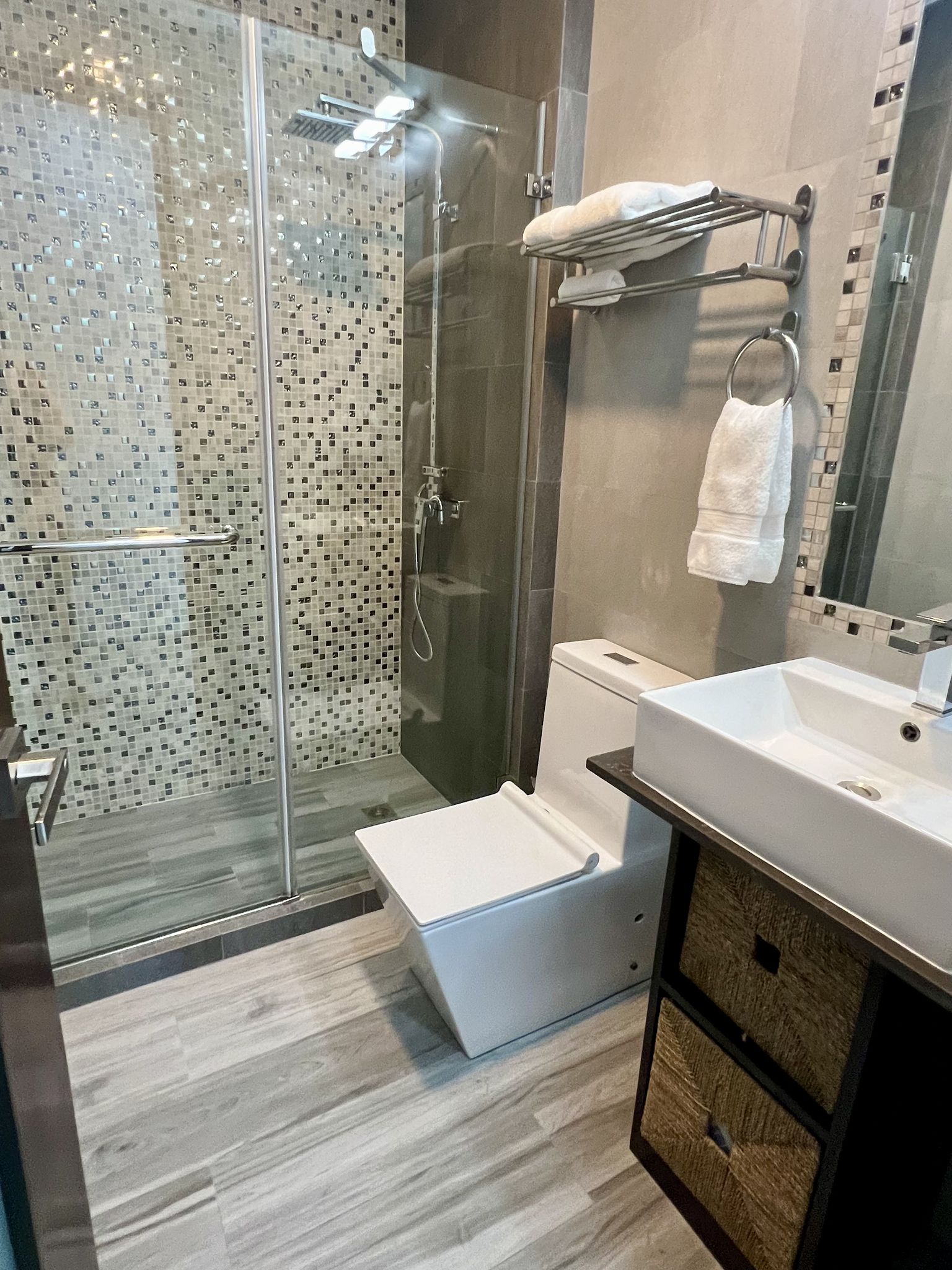 As you enter this splendid condo, an open-plan layout unfolds before you, inviting warmth and social connection. The kitchen, a masterpiece of modern design, boasts top-of-the-line appliances and ample space, encouraging culinary exploration. The living area, adorned with a comfortable sectional couch and a 55-inch smart TV, seamlessly transitions into a dining space capable of hosting up to six guests, making it an ideal setting for intimate gatherings.